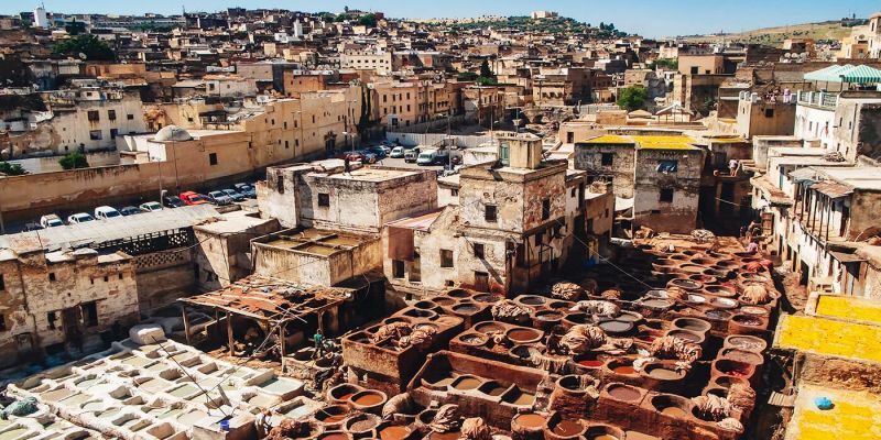Fez también es famosa por sus tenerías de cuero, donde todavía se curten y tiñen las pieles de forma artesanal en grandes cubas de colores. La ciudad está llena de sonidos, aromas y escenas cotidianas que permiten al viajero sumergirse en el Marruecos más tradicional.