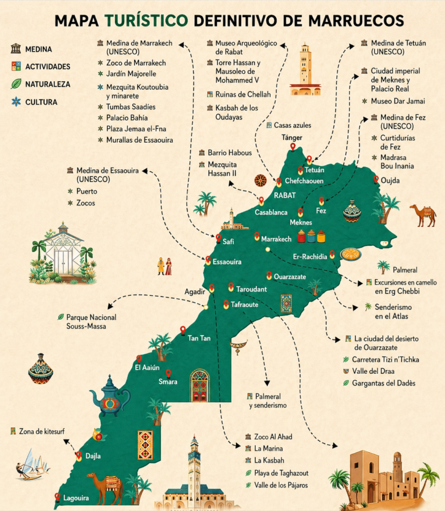Si estás pensando qué ver en Marruecos o cómo organizar tu viaje, esta guía te ayudará a descubrir los lugares más especiales del país. En Marruecos Desde Dentro, agencia especializada en viajes por Marruecos, te acompañamos para que vivas una experiencia auténtica, segura y llena de momentos inolvidables.